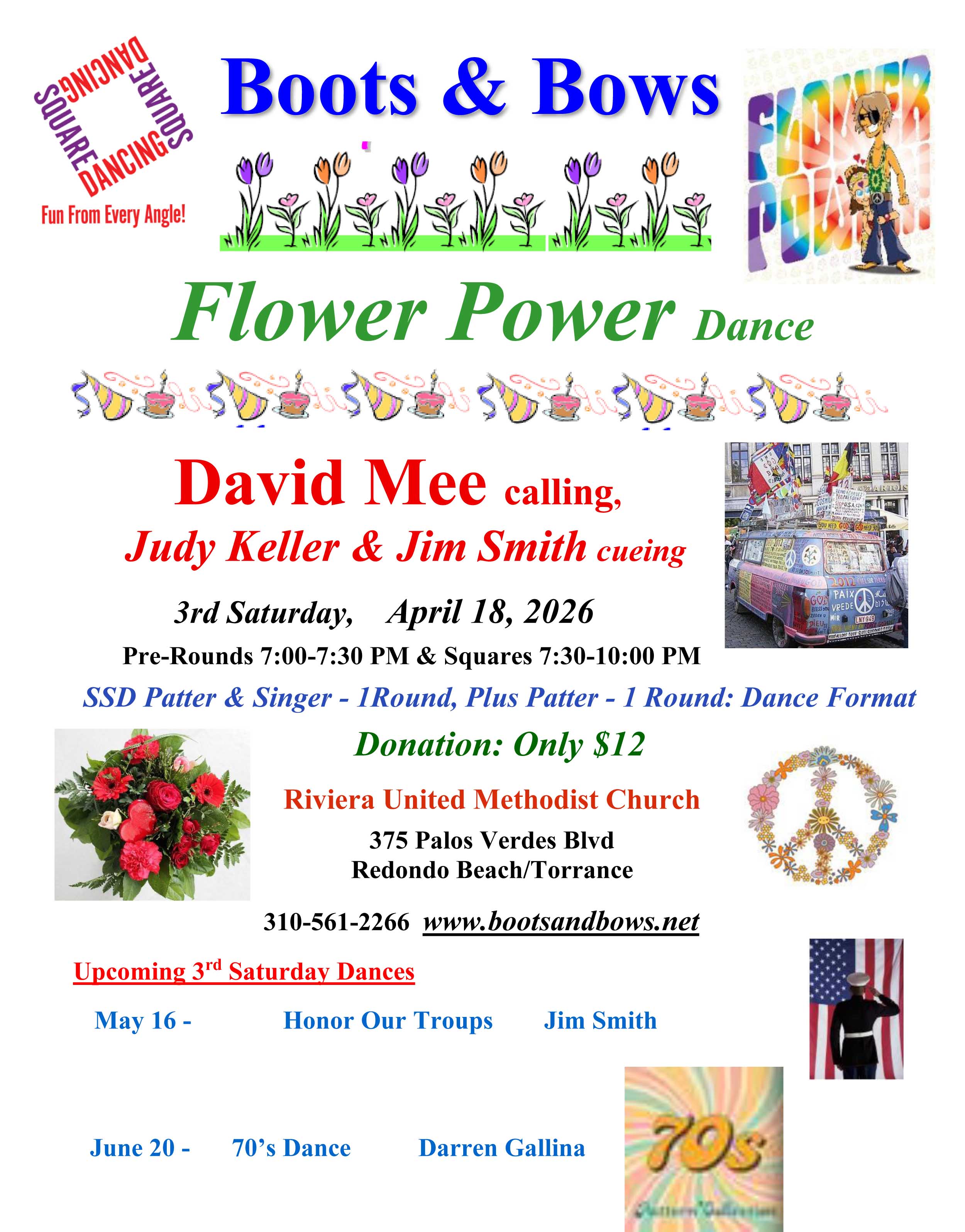 Boots and Bows dances feature round dances from 7:00 - 7:30 PM. Dance schedule from 7:30 to 10:00 is an SSD tip (patter and singing call), followed by one round dance, followed by a Plus patter, followed by one round dance . We will be at the Riviera United Methodist Church in Redondo Beach. Check out our locations tab for zoomable maps to our class and dance locations.